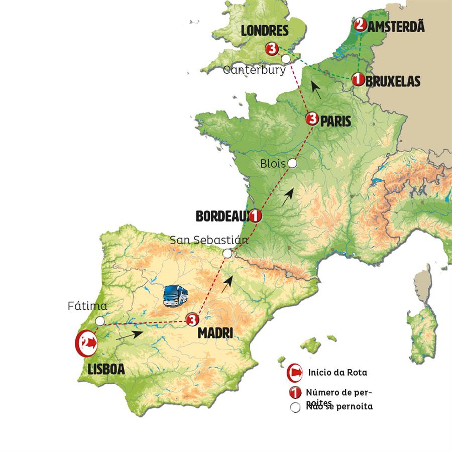 Lisboa, Cáceres, Madrid, San Sebastian, Bordeaux, Blois, Paris, Canterbury, Londres.