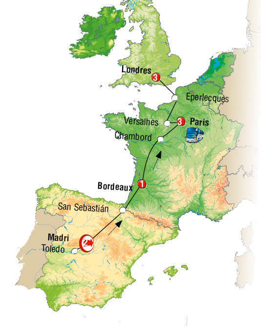 Lisboa, Cáceres, Madrid, San Sebastian, Bordeaux, Chambord, Paris, Canterbury, Londres.