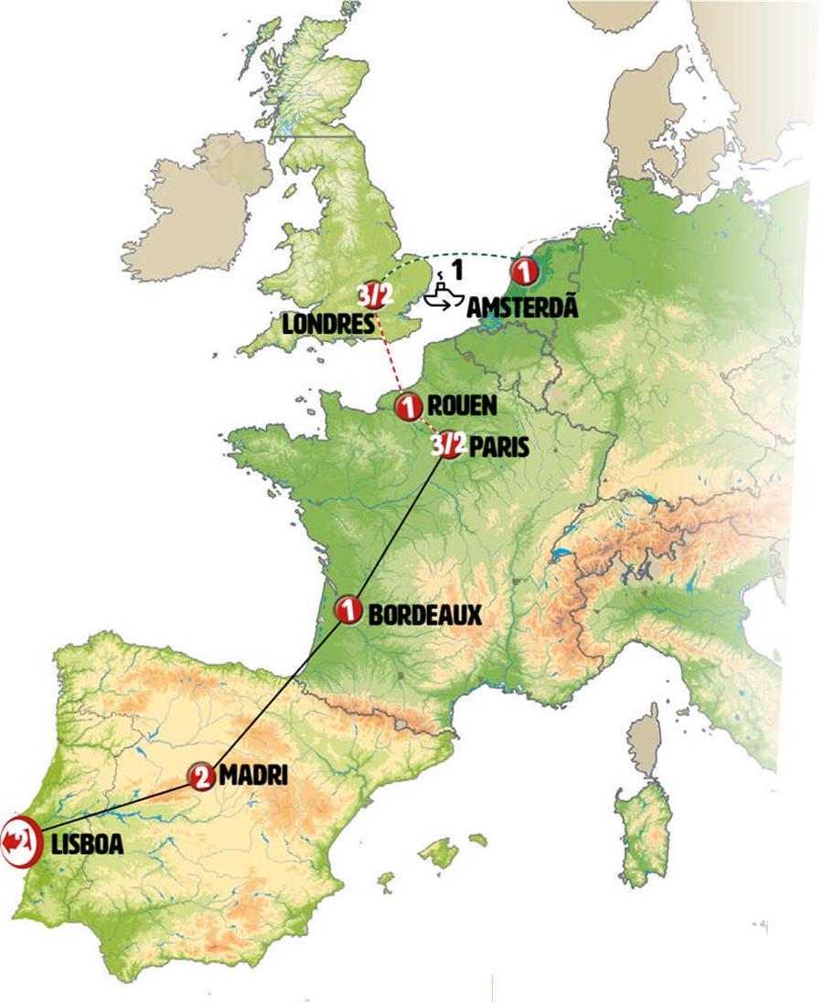 Lisboa, Cáceres, Madrid, San Sebastian, Bordeaux, Chambord, Paris, Rouen, canal de la mancha, Canterbury, Londres.