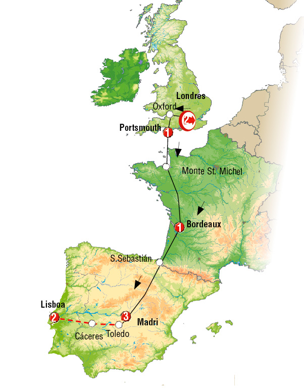 Londres, Oxford, barco porthsmouth saint malo, Mont Saint Michel, saint malo, Dinan, Rennes, Angers, Tours, Bordeaux, San Sebastian, Area de Serviço Foronda, Madrid.