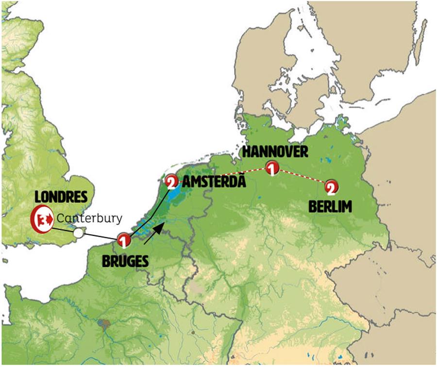 Londres, canal de la mancha, Bruges, Gante, Middelburg, Roterdã, Amsterdã.