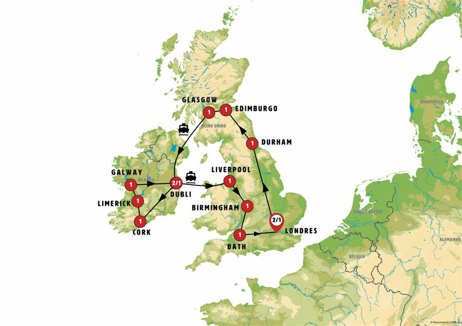 Londres, Cambridge, York, Durham, Alnwick, Edimburgo, Inverness, Lago Ness, Fort Augustus, Glasgow, belfast, Dublin, Powerscourt, Kilkenny, Cashel, Cork, Kinsale, Killarney, Limerick, Acantilados de Moher, Galway, Clonmacnoise, Caernarfon, Liverpool, Chester, lichfield, Birmingham, stratford, stow on the wold, gloucester, Bath, stonehenge, Salisbury.