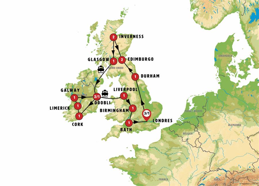 Londres, Cambridge, York, Durham, Alnwick, Edimburgo, los kelpies, Stirling, Pitlochry, culloden, Inverness, Fort William, Inveraray, Lago Lomond, Glasgow, belfast, Dublin, Powerscourt, Kilkenny, Cashel, Cork, Kinsale, Killarney, Limerick, Acantilados de Moher, Galway, Clonmacnoise, Caernarfon, Liverpool, Chester, lichfield, Birmingham, stratford, stow on the wold, gloucester, Bath, stonehenge, Salisbury.