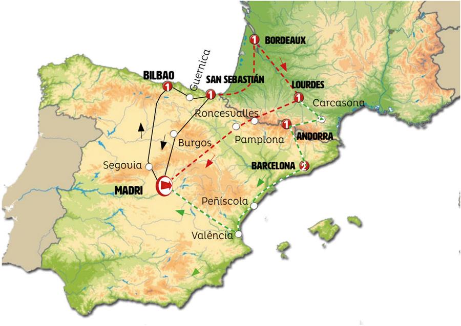 Madrid, Segóvia, pedraza, Bilbao, guernica, San Sebastian, Bordeaux, Lourdes, Sallent de Gallego, Zaragoza.