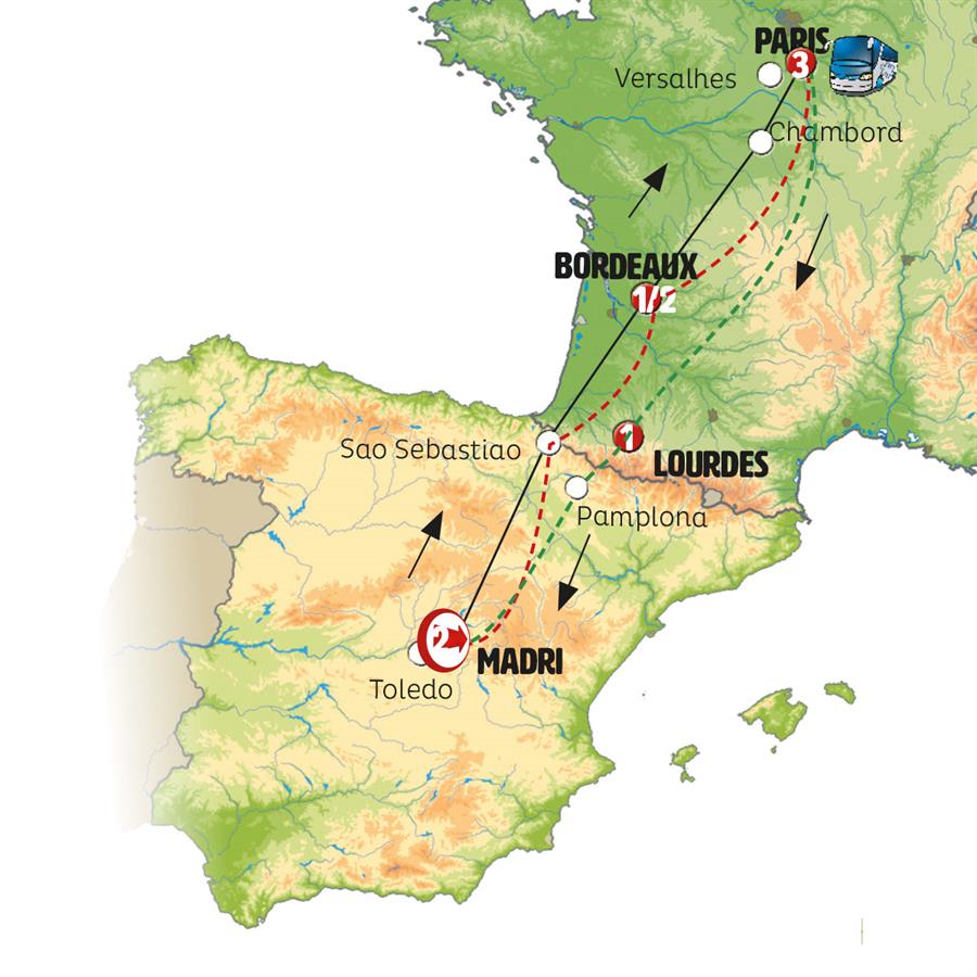 Madrid, San Sebastian, Bordeaux, Chambord, Paris, Blois, Tours, Area de Serviço Foronda.