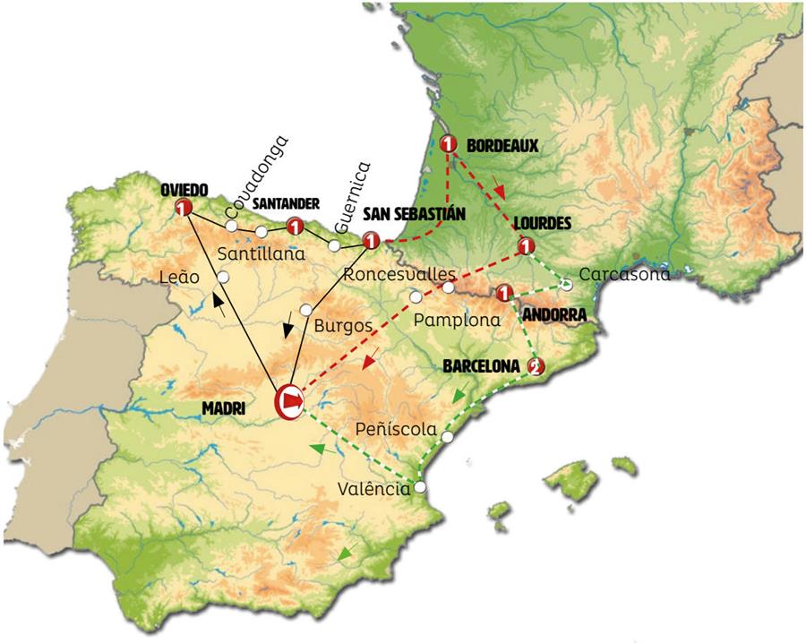Madrid, León, Oviedo, Covadonga, Santilhana, Santander, Bilbao, guernica, San Sebastian, Burgos.