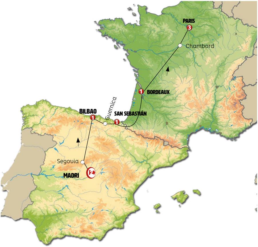 Madrid, Segóvia, pedraza, Bilbao, guernica, San Sebastian, Bordeaux, Chambord, Paris.