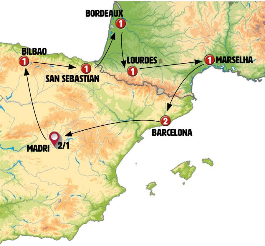 Madrid, Segóvia, pedraza, Bilbao, guernica, San Sebastian, Bordeaux, Lourdes, Carcassonne, narbona, Marselha, Aix en Provence, Avignon, puente del gard, Barcelona, peniscola, Valência.