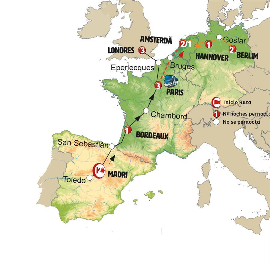 Madrid, San Sebastian, Bordeaux, Chambord, Paris, Canterbury, Londres.