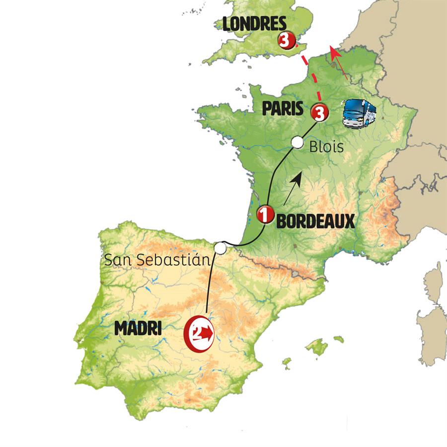 Madrid, San Sebastian, Bordeaux, Blois, Paris, Canterbury, Londres.