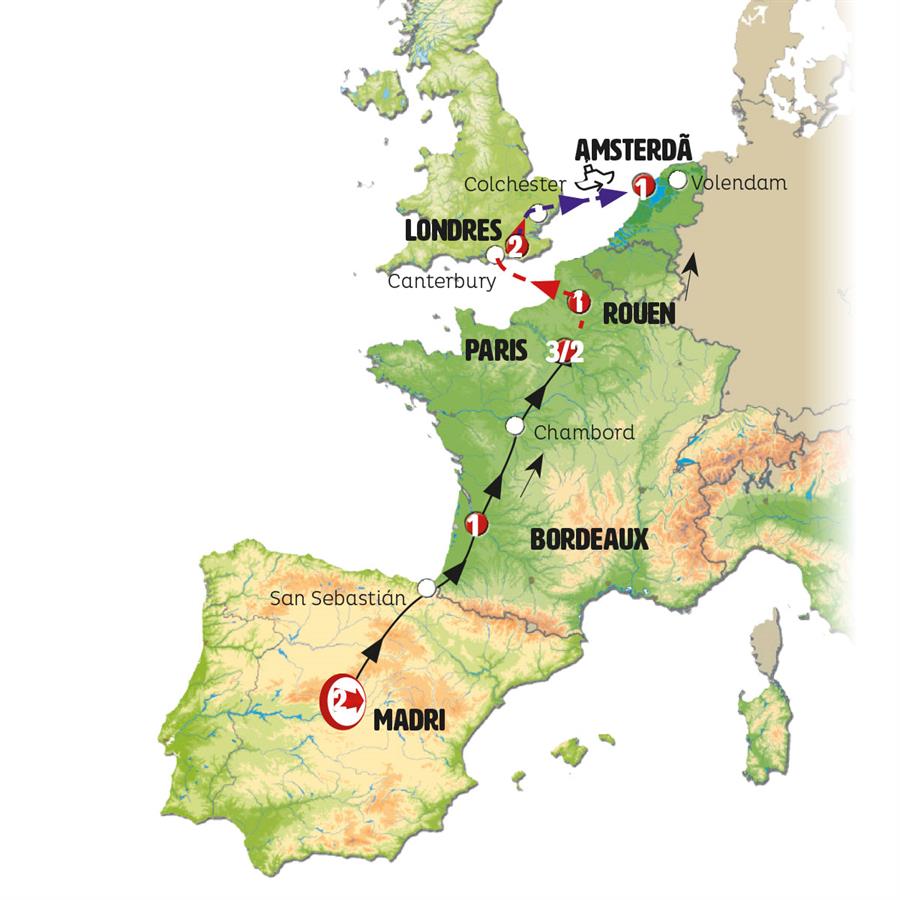 Madrid, San Sebastian, Bordeaux, Chambord, Paris, Rouen, canal de la mancha, Canterbury, Londres, colchester, ferri colchester volendam, Volendam, Amsterdã.