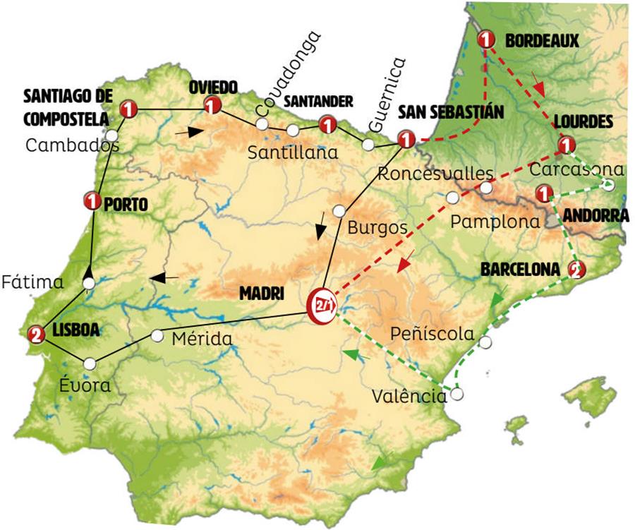 Madrid, Merida, Évora, Lisboa, Fátima, Porto, Santuario do Bom Jesus, Cambados, Santiago de Compostela, Lugo, Cebreiro, León, Oviedo, Covadonga, Santilhana, Santander, Bilbao, guernica, San Sebastian, Burgos.