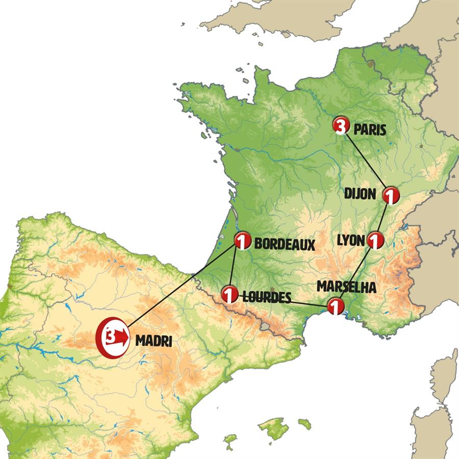Madrid, San Sebastian, Bordeaux, Lourdes, Carcassonne, narbona, Marselha, Arles, Avignon, Lyon, Tournus, castillo de savigny, Beaune, Dijon, abadia de fontenay, semur en auxois, vezelay, Paris.