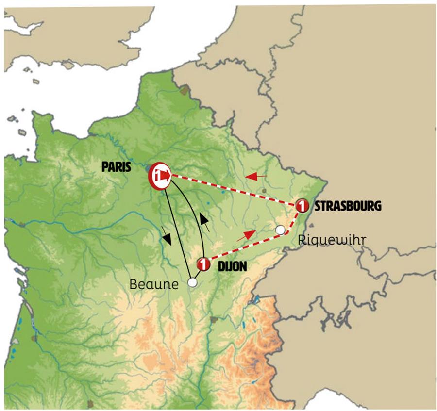 Bem-vindo ao seu circuito Europamundo!Partimos para o leste da França, paisagens agradáveis viajando em direção à Borgonha. Fazemos uma breve parada em NOYERS SUR SEREIN, considerada uma das mais belas vilas da França, com ruas estreitas com casas de pedra em enxaimel, charmosa praça central e muralha. Continuamos nossa rota para BEAUNE, a capital do vinho da Borgonha. Tempo para almoçar e passear, sugerimos visitar seu Hospício Histórico, um hospital medieval do século 15 para pessoas sem recursos. Depois continuamos para DIJON, capital da região, ruas animadas, magnífico complexo urbano com seus muitos edifícios medievais e renascentistas, com destaque para o Palácio dos Duques. Acomodação.