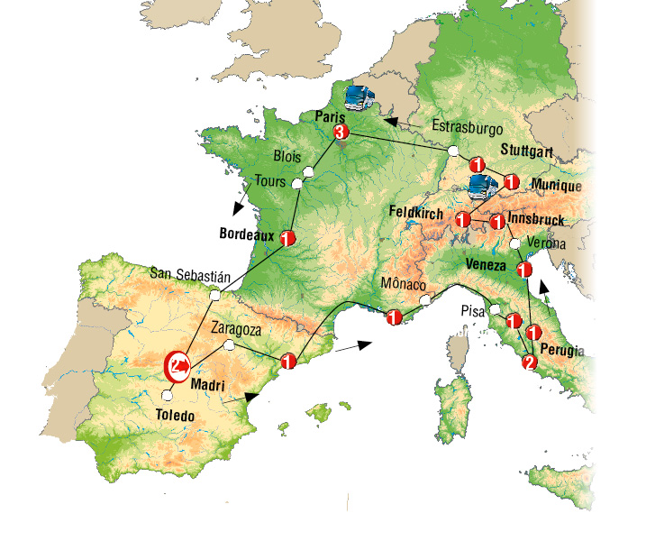 Madrid, Zaragoza, Barcelona, Cote D´azur, Cidade de Mônaco, Gênova, Pisa, Florença, Roma, Bolonha, Ferrara, Veneza, Verona, Lago de Garda, Innsbruck, zugspitze, Feldkirch, Lago Constança , Lindau, Munique, Stuttgart, Heidelberg, Strasbourg, Paris, Blois, Tours, Bordeaux, San Sebastian, Area de Serviço Foronda.