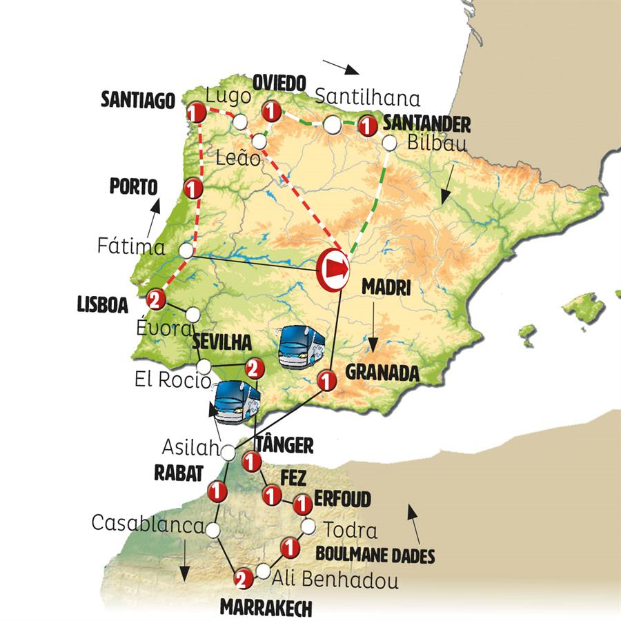 Madrid, Granada, Tânger, assilah, Rabat, Casablanca, Marrakech, ait ben hadu, Ouarzazate, Boumalne Dadès, Todra, Erfoud, Fes, Sevilha, Merida, Évora, Lisboa, Fátima, Porto, Santuario do Bom Jesus, Cambados, Santiago de Compostela, Lugo, Cebreiro, León.