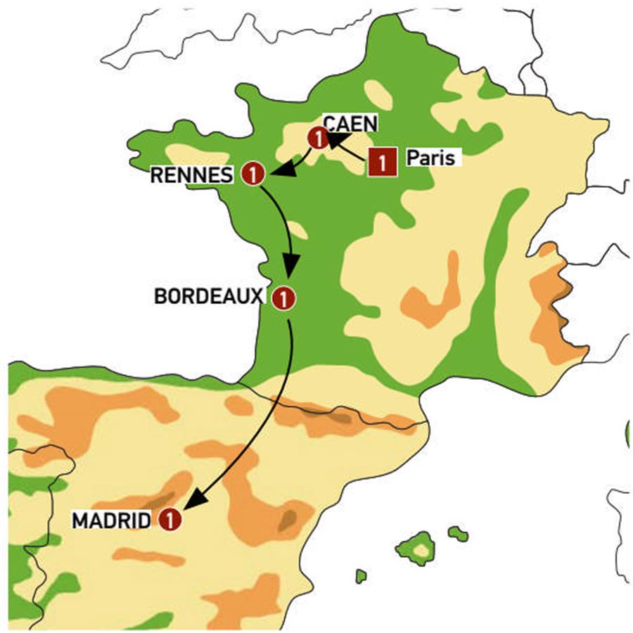 Paris, Rouen, Arromanches, Caen, Mont Saint Michel, saint malo, Dinan, Rennes, Angers, Tours, Bordeaux, San Sebastian, Area de Serviço Foronda, Madrid.
