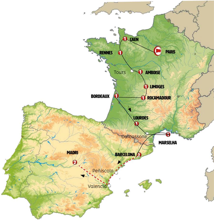 Paris, Rouen, Arromanches, Caen, Mont Saint Michel, saint malo, Dinan, Rennes, Angers, Tours, Villandry, Amboise, Chenonceaux, Chambord, Limoges, Sarlat, beynac et cazenac, Rocamadour, Caverna de Padirac, collonges la rouge, Saint Emilion, Bordeaux, Lourdes, Carcassonne, narbona, Marselha, Aix en Provence, Avignon, puente del gard, Barcelona, peniscola, Valência, Madrid.