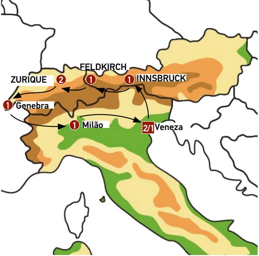 Veneza, Verona, Lago de Garda, Innsbruck, zugspitze, Feldkirch, saint gallen, Constança, Stein Am Rhein S, cataratas del rin, Zurich, Berna, Montreux, Genebra, Milão.
