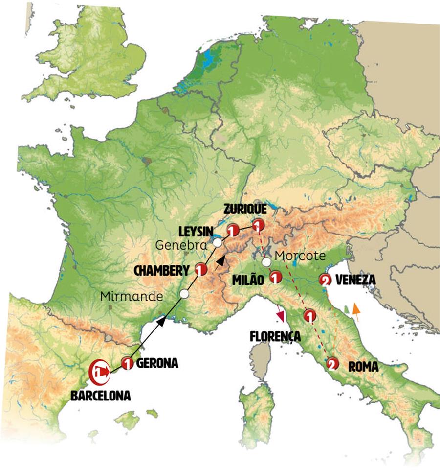 Barcelona, Gerona, carrieres de lumiere, Chambery, Genebra, Gruyeres, Leysin, Interlaken, Lucerna, Zurich, Bellinzona, Como, Milão, Gênova, Pisa, Florença, Roma.