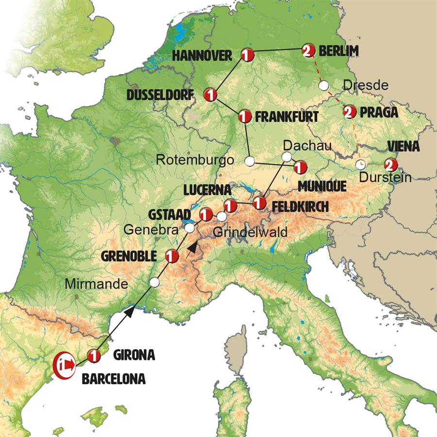 Barcelona, Gerona, carrieres de lumiere, Chambery, Genebra, Gruyeres, Leysin, Interlaken, Lucerna, Einsiedeln, Vaduz, Feldkirch, Lago Constança , Lindau, Munique, Füssen, Rotemburgo, Frankfurt, crucero por el rhin, Colônia, Dortmund, ruta cuentos de hadas, Hannover, Goslar, Berlim, Dresden, Praga, Ceske Budejovice, Cesky Krumlov, Viena.