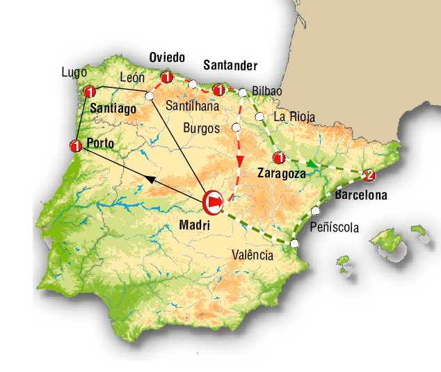 Madrid, Cidade Rodrigo, Porto, Santuario do Bom Jesus, Cambados, Santiago de Compostela, Lugo, Cebreiro, León.