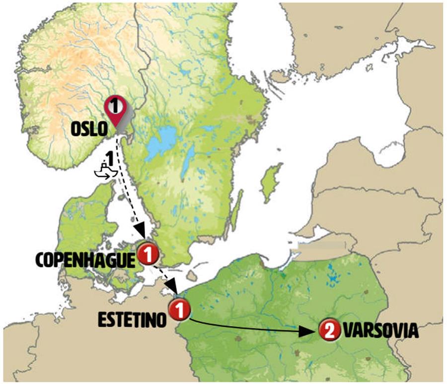 Oslo, ferri oslo copenhague, Copenhague, Rostock, Szczecin, Bydgoszcz, Torun, Varsóvia.