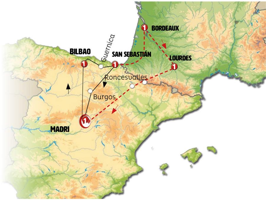 Madrid, Segóvia, pedraza, Bilbao, guernica, San Sebastian, Bordeaux, Lourdes, Sallent de Gallego, Zaragoza.
