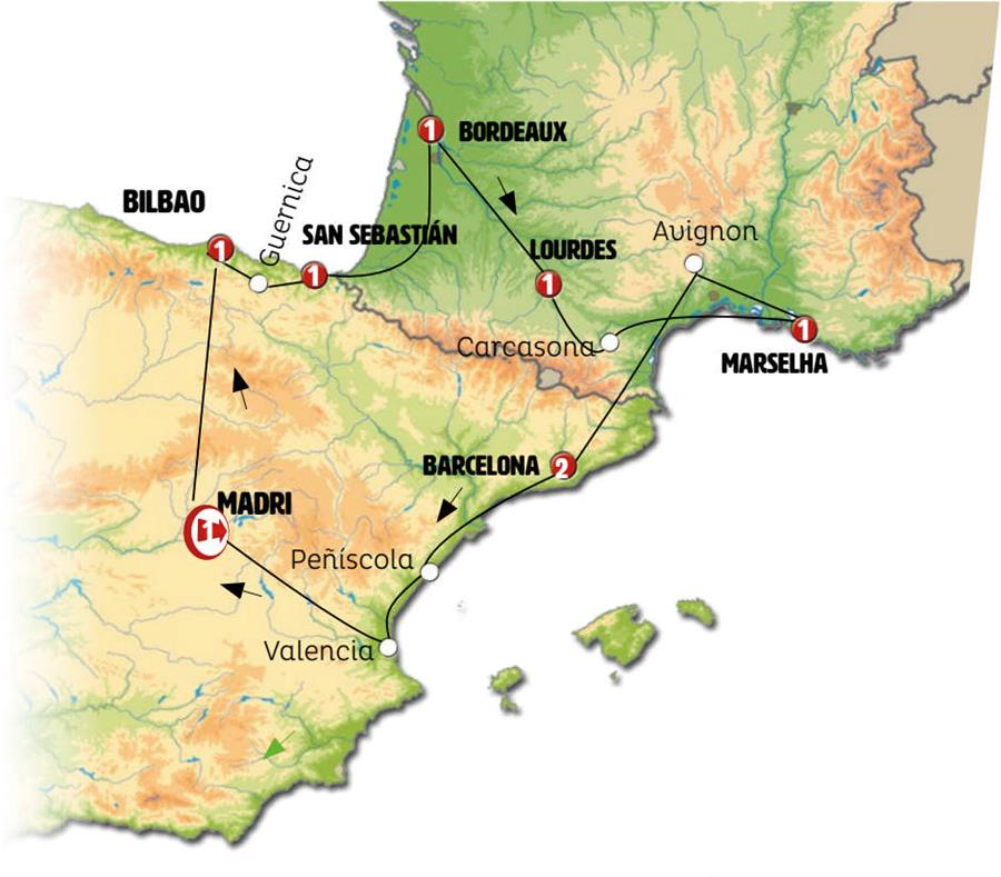 Madrid, Segóvia, pedraza, Bilbao, guernica, San Sebastian, Bordeaux, Lourdes, Carcassonne, narbona, Marselha, Aix en Provence, Avignon, puente del gard, Barcelona, peniscola, Valência.