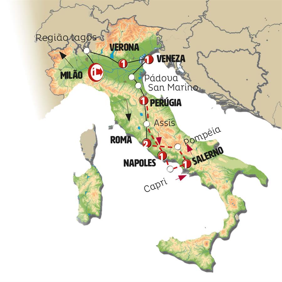 Milão, Região dos Lagos, Verona, Veneza, Pádua, San Marino, Gubbio, Perugia, Assis, Roma, Nápoles, Capri, Sorrento, Salerno, Pompeia, Cassino.