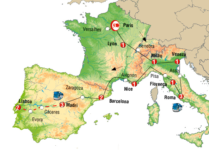Paris, borgoña, Beaune, Lyon, Genebra, Milão, Veneza, Ravena, Assis, Roma, Florença, Pisa, SESTRI LEVANTE, Montecarlo, Cote D´azur, Arles, Barcelona, comarca del penedes, Zaragoza, Madrid, Merida, Évora, Lisboa.