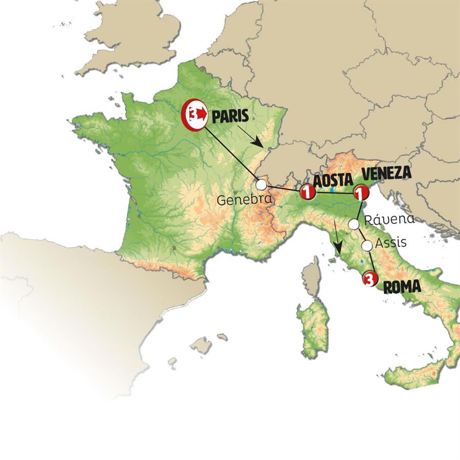 Paris, Genebra, Aosta, Veneza, Ravena, Assis, Roma.