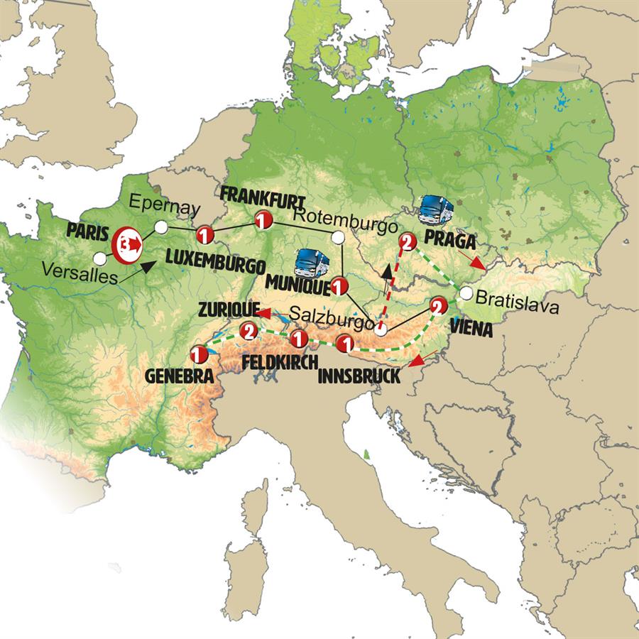 Paris, Bouillon, Luxemburgo, Cochem, crucero por el rhin, Frankfurt, Rotemburgo, Munique, Salzburgo, St. Wolfgang, Lago Traunsee, Viena.