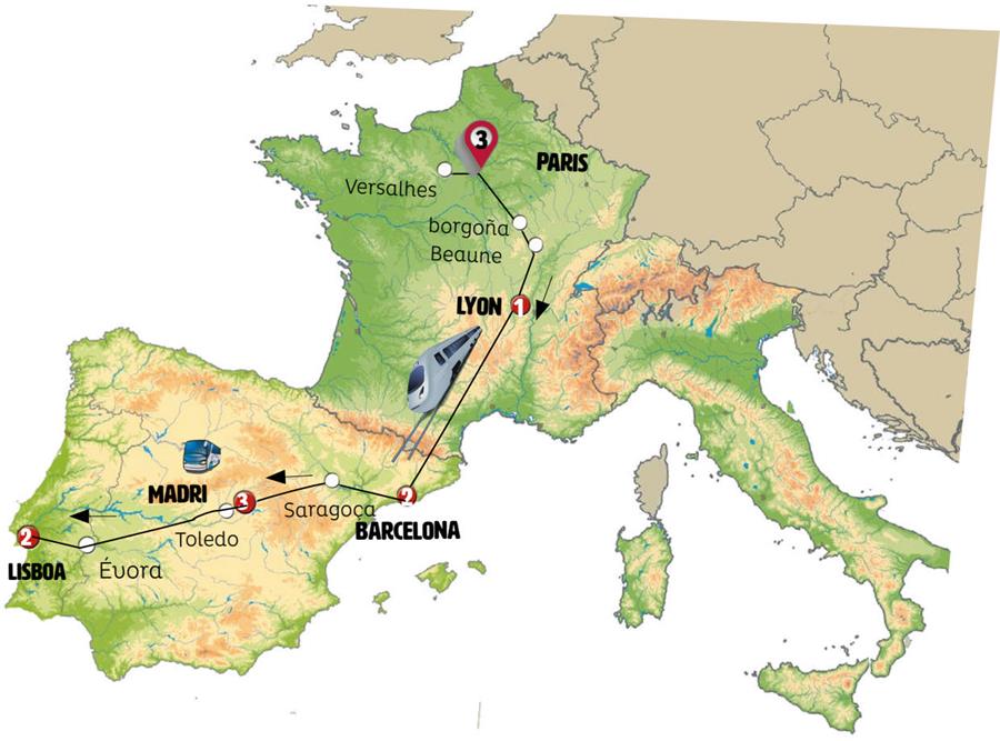 Paris, borgoña, Beaune, Lyon, Barcelona, comarca del penedes, Zaragoza, Madrid, Merida, Évora, Lisboa.