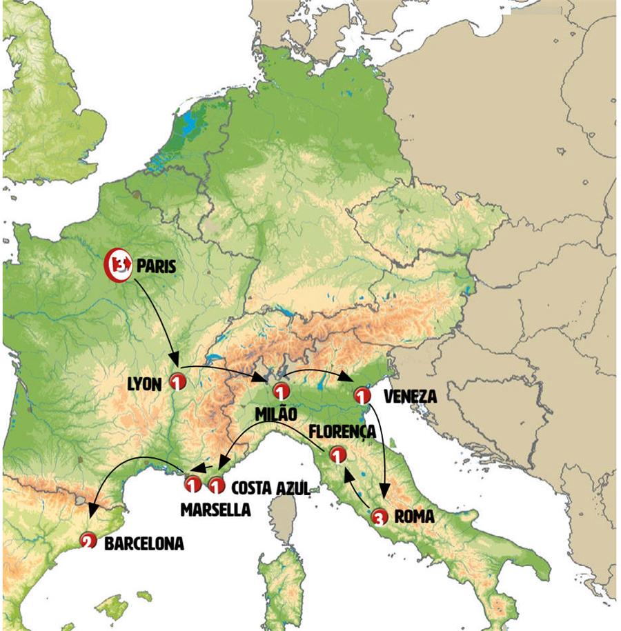 Paris, borgoña, Beaune, Lyon, Genebra, Milão, Veneza, Ravena, Assis, Roma, Florença, Pisa, SESTRI LEVANTE, Montecarlo, Cote D´azur, santa maxima, Saint Tropez, Marselha, Aix en Provence, Avignon, puente del gard, Barcelona.