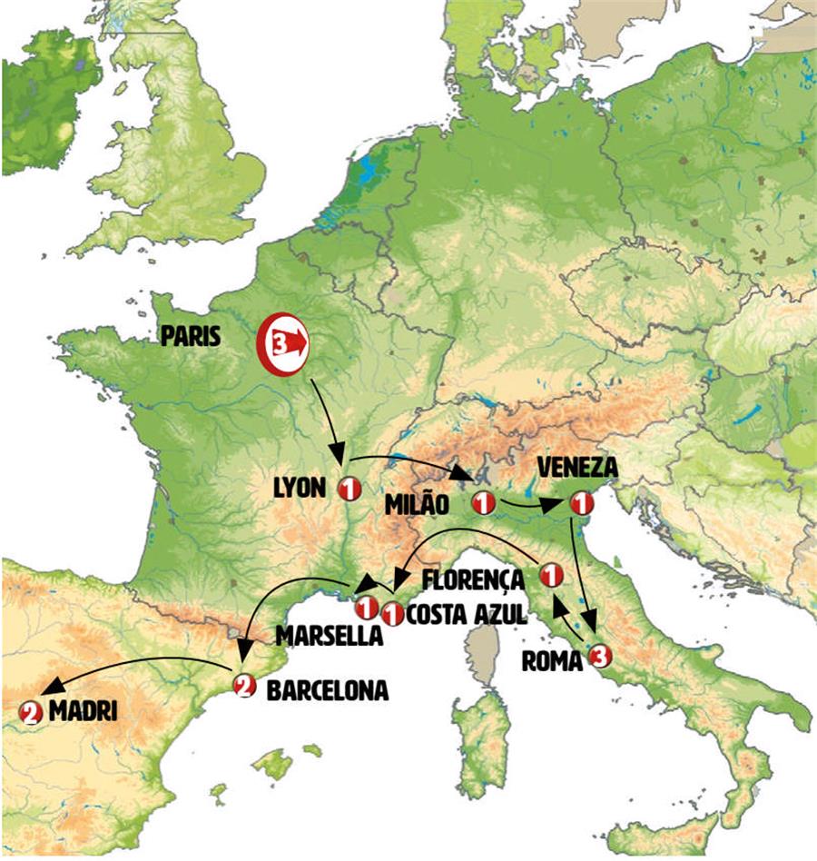Paris, borgoña, Beaune, Lyon, Genebra, Milão, Veneza, Ravena, Assis, Roma, Florença, Pisa, SESTRI LEVANTE, Montecarlo, Cote D´azur, santa maxima, Saint Tropez, Marselha, Aix en Provence, Avignon, puente del gard, Barcelona, peniscola, Valência, Madrid.