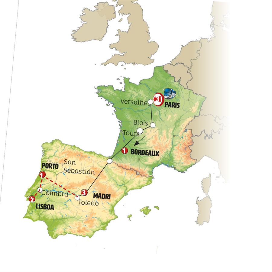 Paris, Blois, Tours, Bordeaux, San Sebastian, Area de Serviço Foronda, Madrid, Cidade Rodrigo, Porto, Coimbra, Batalha, Nazaré, Óbidos, Lisboa.