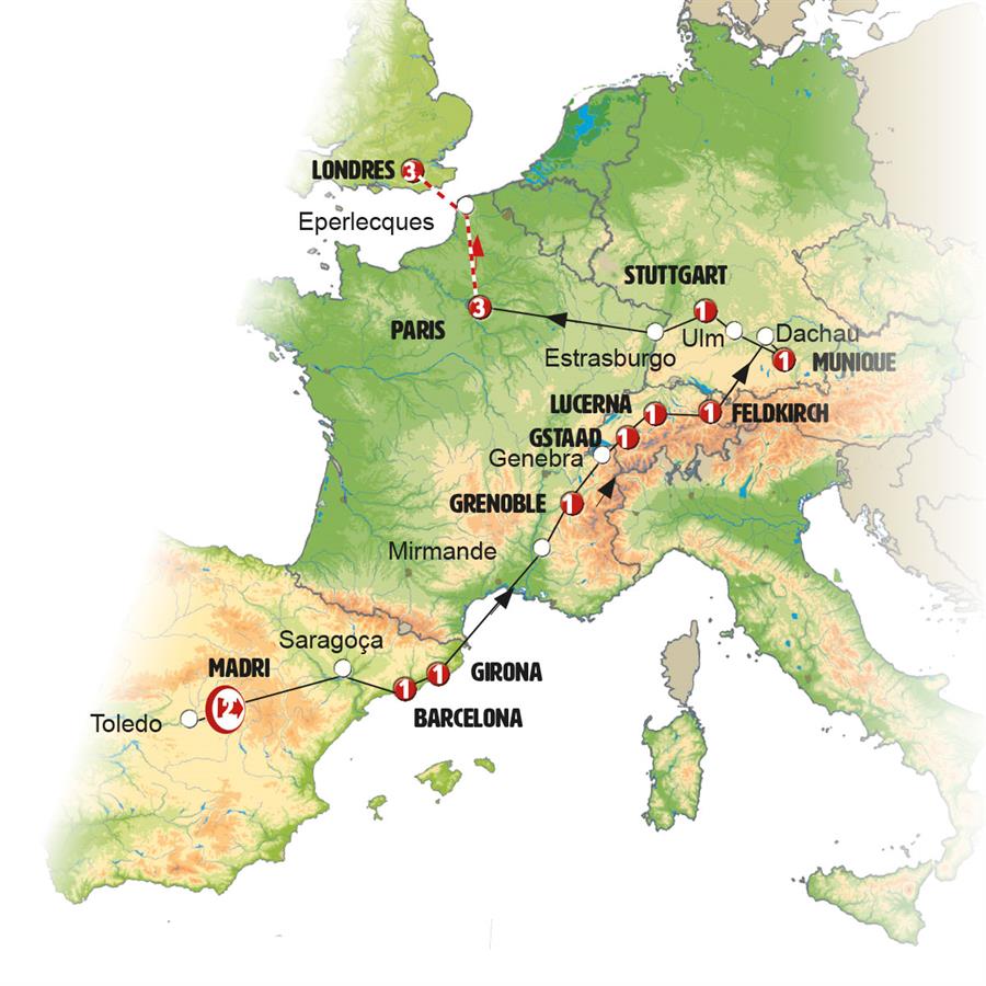 Madrid, Zaragoza, Poblet, Barcelona, Gerona, carrieres de lumiere, Chambery, Genebra, Gruyeres, Leysin, Interlaken, Lucerna, Einsiedeln, Vaduz, Feldkirch, Lago Constança , Lindau, Munique, Stuttgart, Heidelberg, Strasbourg, Paris.