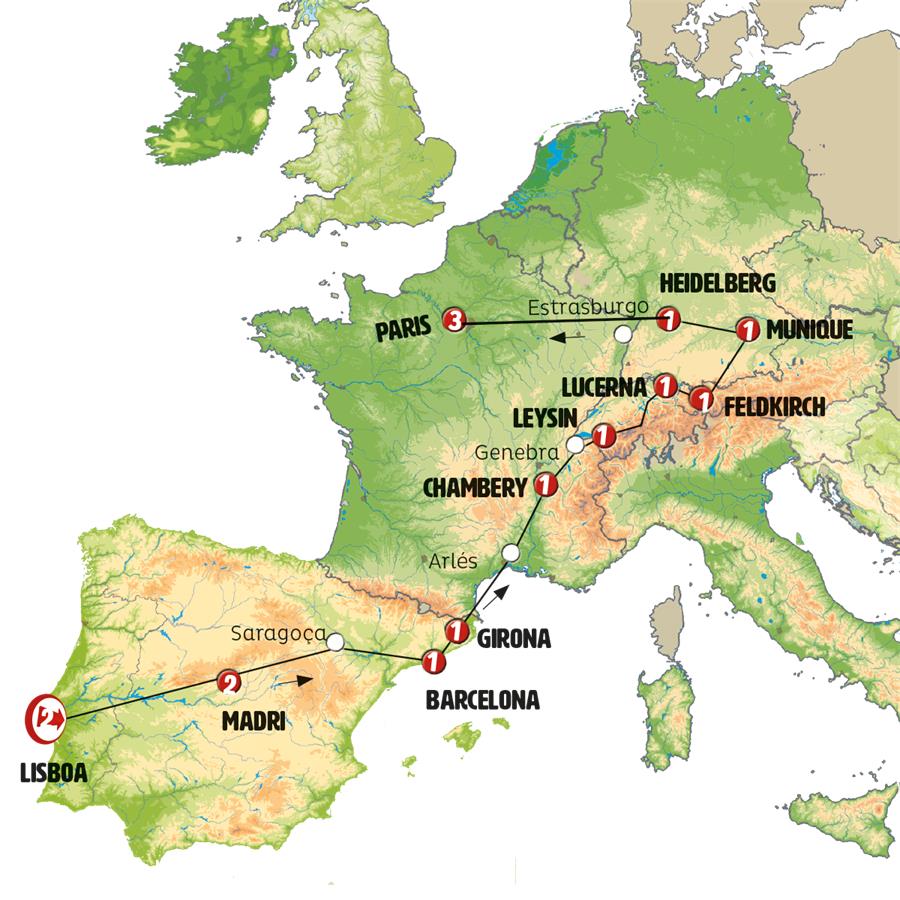 Lisboa, Cáceres, Madrid, Zaragoza, Poblet, Barcelona, Gerona, carrieres de lumiere, Chambery, Genebra, Gruyeres, Leysin, Interlaken, Lucerna, Einsiedeln, Vaduz, Feldkirch, Lago Constança , Lindau, Munique, Stuttgart, Heidelberg, Strasbourg, Paris.