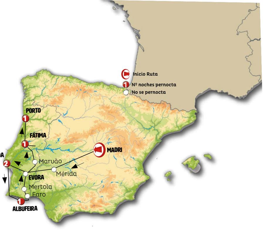 Madrid, Merida, Évora, Lisboa, Lagos, cabo de san vicente , Albufeira, Mértola, Marvão, Castelo de Vide, Tomar, Fátima, Porto.