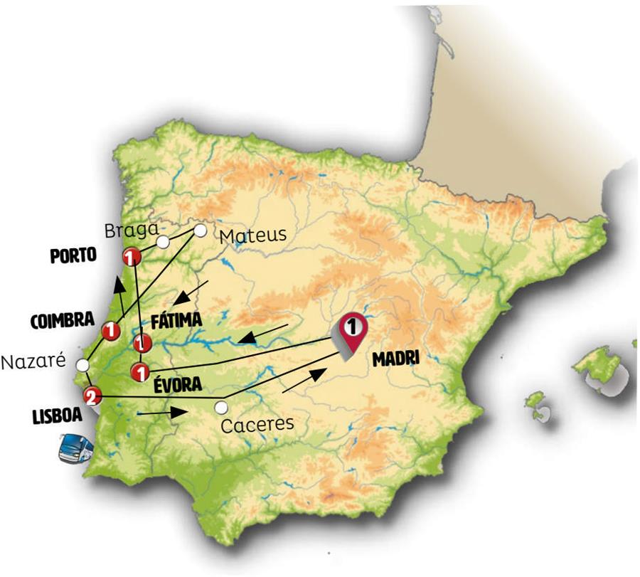 Madrid, Merida, Évora, Marvão, Castelo de Vide, Tomar, Fátima, Porto, Braga, Santuario do Bom Jesus, Guimarães, Aveiro, Coimbra, Batalha, Nazaré, Óbidos, Lisboa, Cáceres.