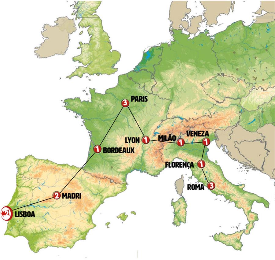 Lisboa, Cáceres, Madrid, San Sebastian, Bordeaux, Chambord, Paris, borgoña, Beaune, Lyon, Genebra, Milão, Veneza, Florença, Siena, Assis, Roma.