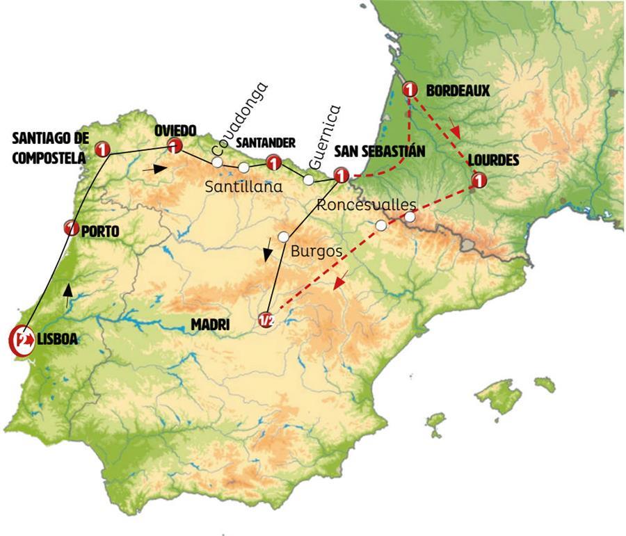 Lisboa, Fátima, Porto, Santuario do Bom Jesus, Cambados, Santiago de Compostela, Lugo, Cebreiro, León, Oviedo, Covadonga, Santilhana, Santander, Bilbao, guernica, San Sebastian, Bordeaux, Lourdes, Sallent de Gallego, Zaragoza, Madrid.