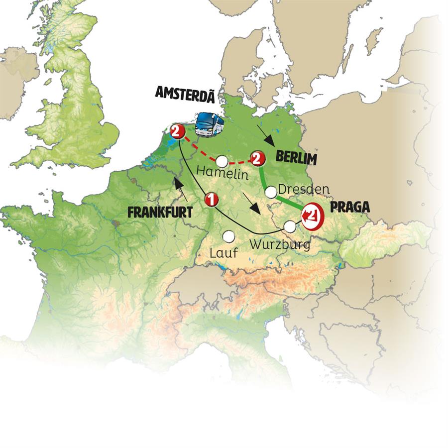 Praga, Pilsen, Rotemburgo, Frankfurt, crucero por el rhin, Colônia, Amsterdã, Hamelin, Berlim.