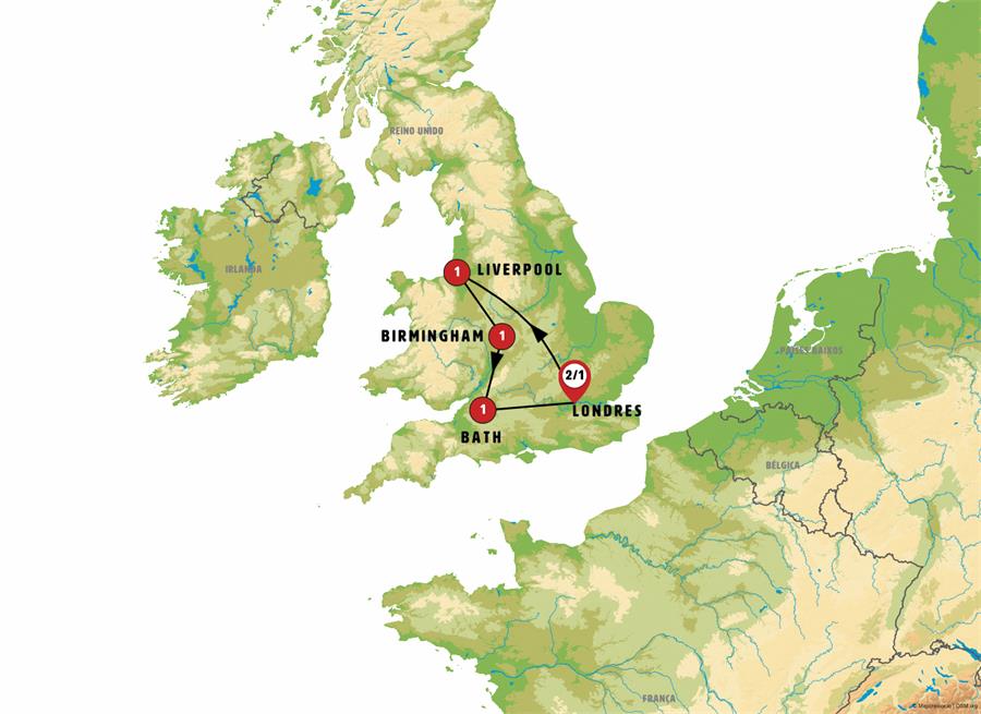 Londres, Cambridge, coventry, Liverpool, Chester, lichfield, Birmingham, stratford, stow on the wold, gloucester, Bath, stonehenge, Salisbury.