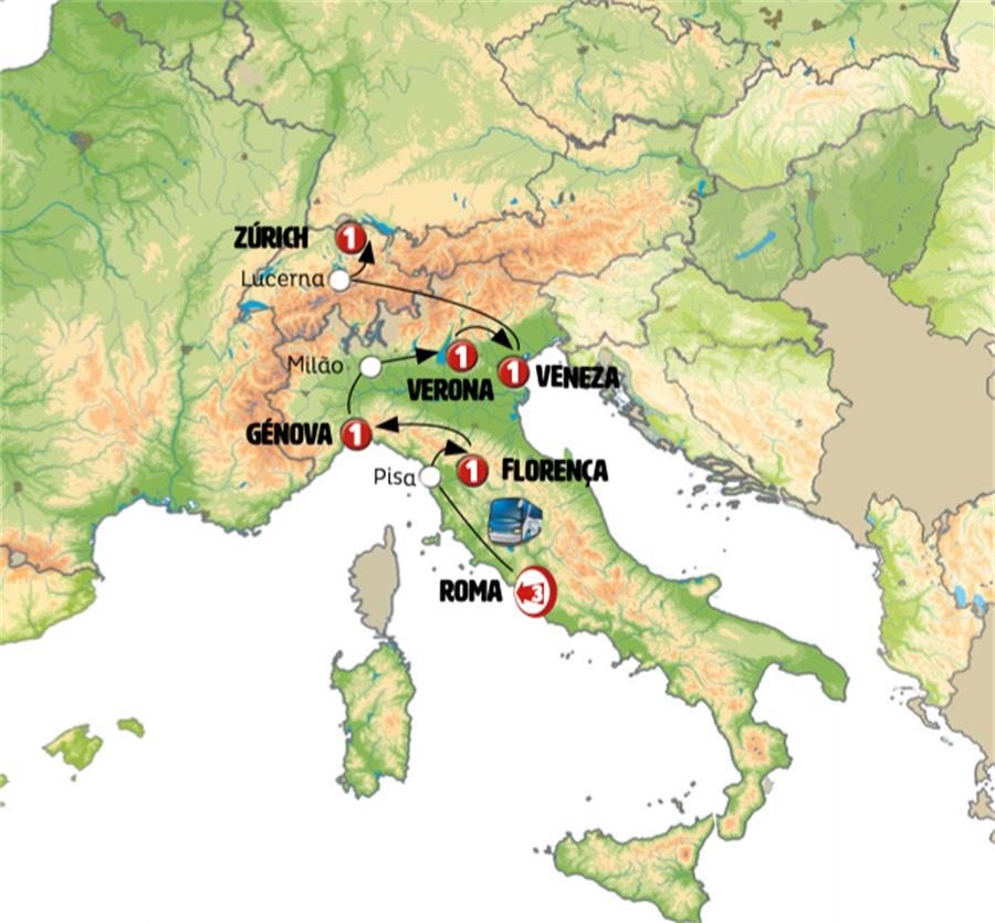 Roma, Pisa, Santa Margherita Ligure, Portofino, Gênova, san giulio, Milão, Verona, Veneza, Lugano, Lucerna, Zurich.