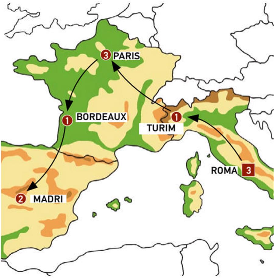 Roma, Pisa, Torino , Genebra, Paris, Blois, Tours, Bordeaux, San Sebastian, Area de Serviço Foronda, Madrid.