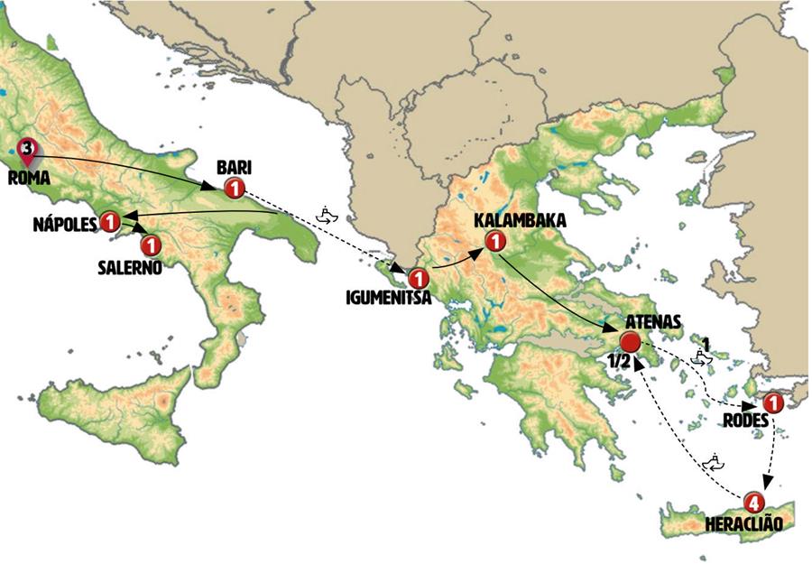 Roma, abadia san giovanni in venere, Termoli, Bari, Brindisi, ferri brindisi igumenitsa, Igumenitsa, Metsovo, Kalambaka, Delfos, Hosios Loukas, Atenas, ferri atenas rodas, Rodes, Heraclion, Santorini.