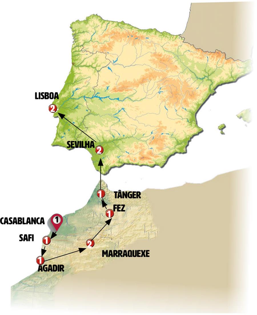 Casablanca, El Jadida, Safi, esauira, Agadir, Marrakech, ouzoud, Fes, Tânger, Sevilha, Merida, Évora, Lisboa.