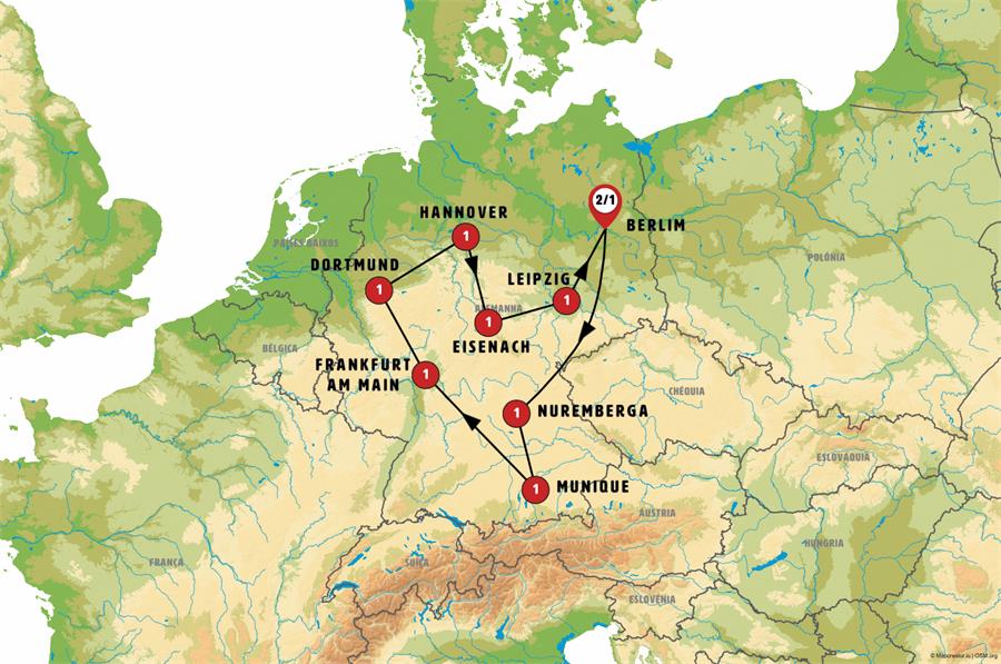 Berlim, Dresden, Bamberg, Nuremberg, kloster weltenburg, Dachau, Munique, Füssen, Rotemburgo, Frankfurt, crucero por el rhin, Colônia, Dortmund, ruta cuentos de hadas, Hannover, Goslar, gotinga, bad sooden, Eisenach, Gotha, Erfurt, Leipzig, Meissen, moritzburg.